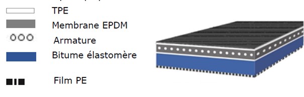 La membrane EPDM est constituée d’un treillis d’armature interne en fibre de verre et d’une couche d’élastomère thermoplastique (TPE) sur les deux faces. Elle est ensuite dotée en sous-face d’un bitume SBS sur laquelle s’applique un film PE.